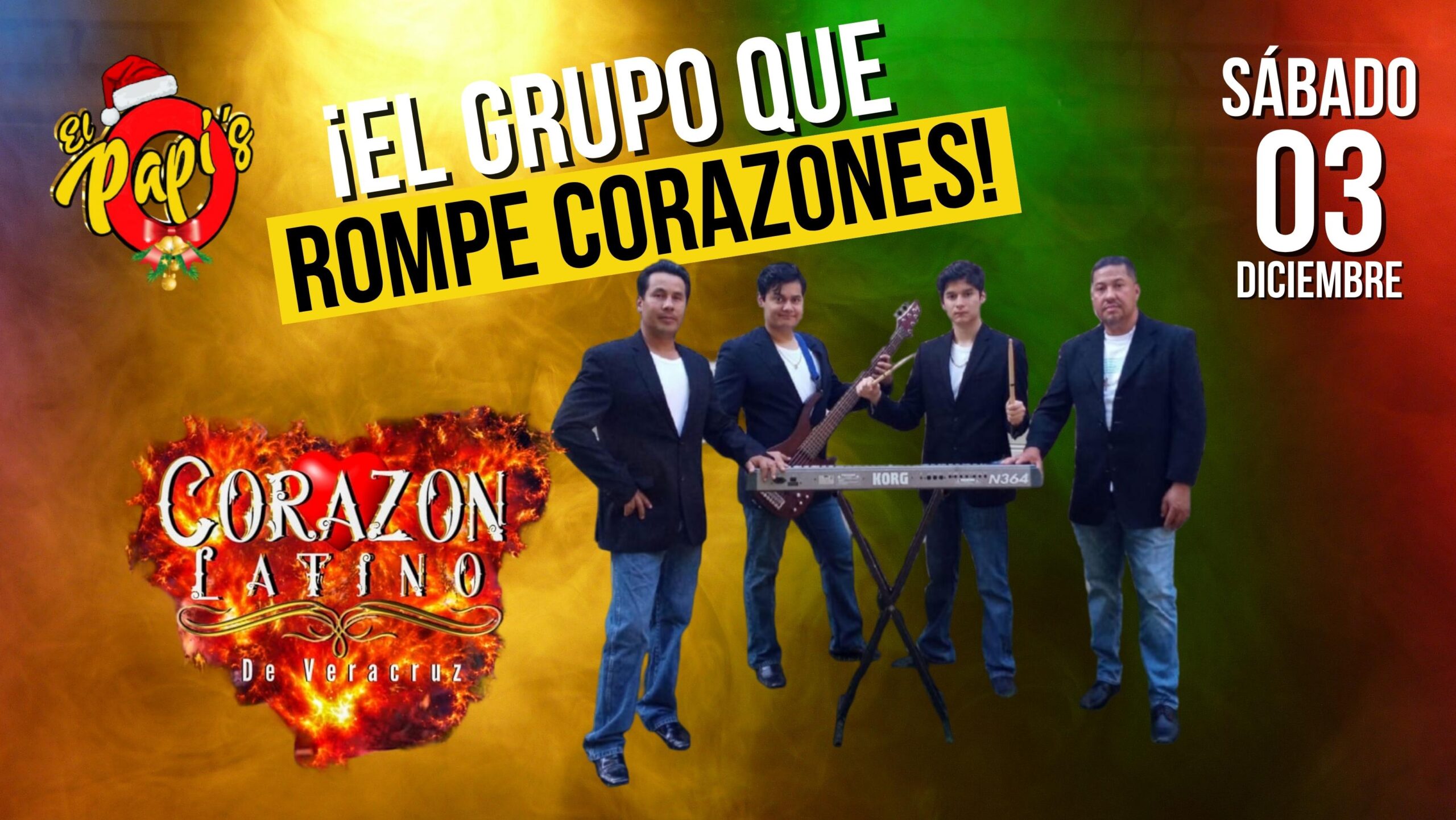 Llega a El Papi's el grupo que rompe corazones “Corazón Latino“ para enamorarlas. Porque en diciembre todo es una fiesta. Ven a bailar al ritmo de este cuarteto y disfrutemos de una noche espectacular. ¡Disfruta de las mejores fiestas con ambiente navideño! Barra Internacional | Cocina Abierta ¡Activa el modo Papi's!