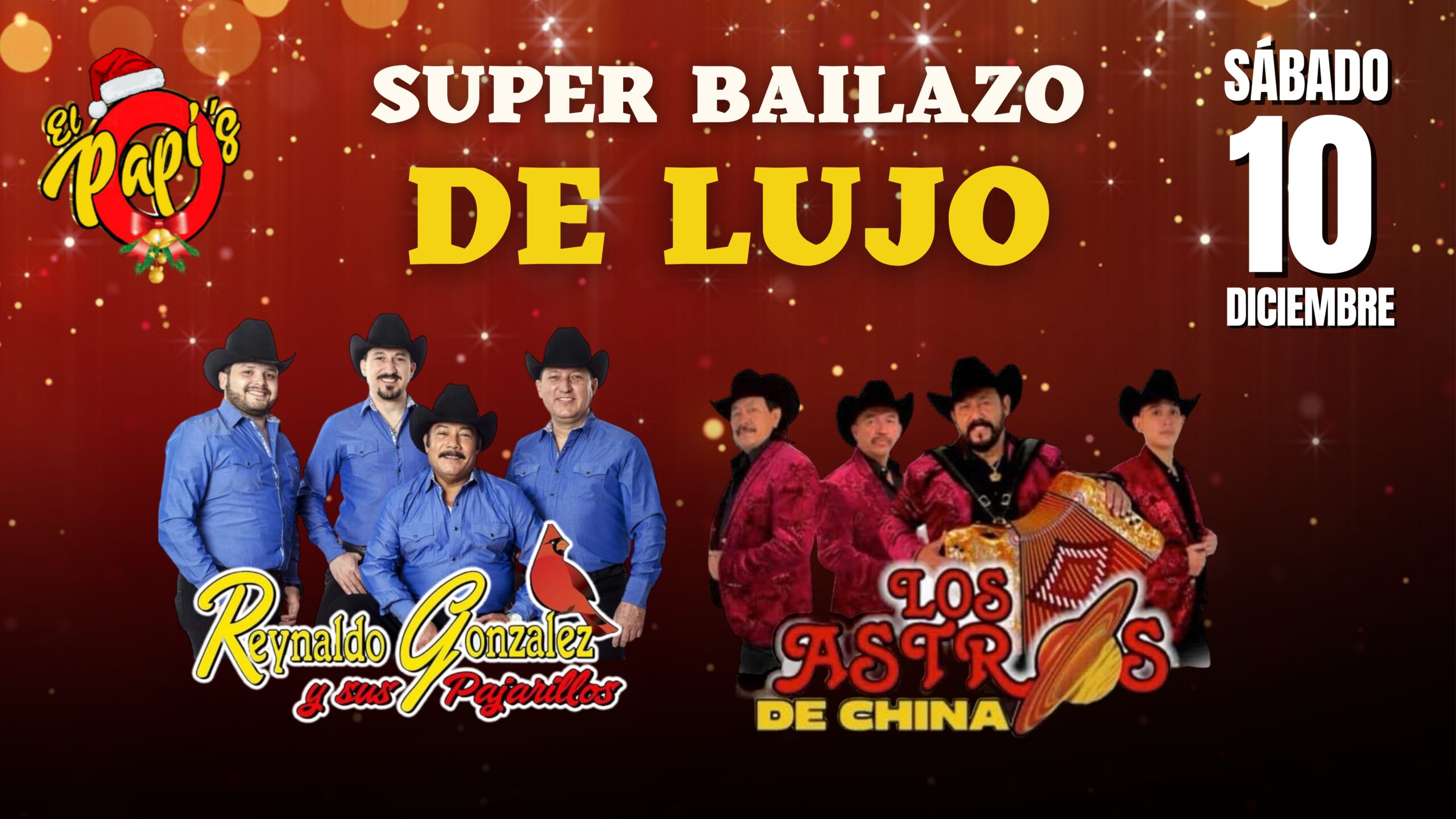 Primera Posada Navideña El Papi’s trae para ustedes lo mejor del regional: Reinaldo Gonzalez y sus pajarillos (Ex Cardenales) Los Astros de China ¡Disfrutar de las mejores fiestas con ambiente navideño! ¡Precios populares para que nadie falte! Barra Internacional | Cocina Abierta ¡Aquí bailas porque bailas compadre!